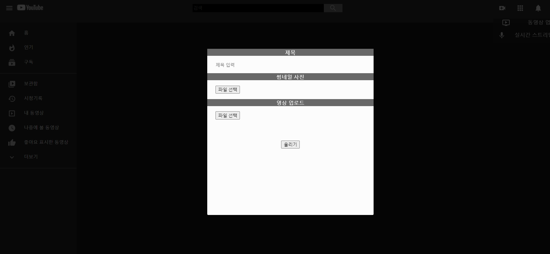 react와 node를 사용해서 youtube clone을 만들어보았다 ,물론 youtube의 모든 기능을 구현한 것은 아니고 react사용해서 간단한 ui나 node사용해서 로그인,영상 업로드 정도만 해보았다.