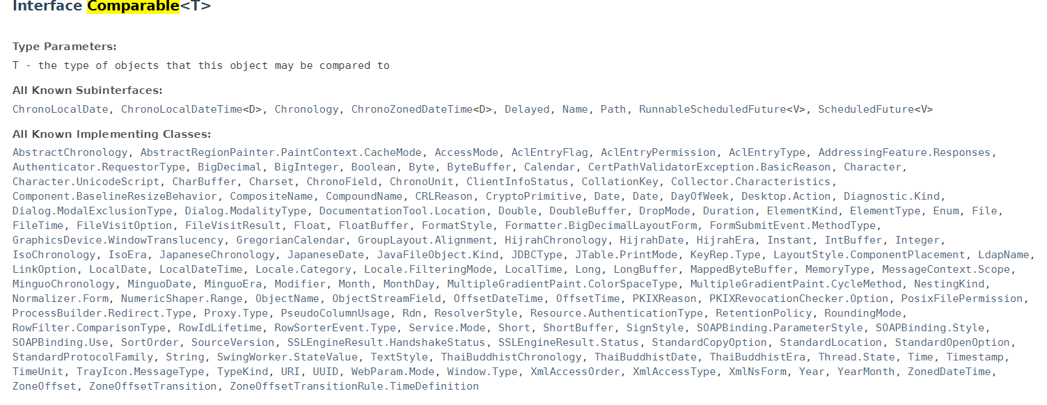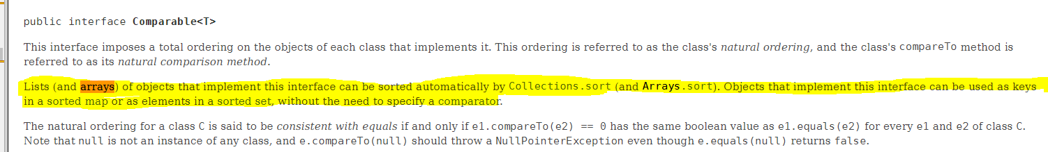 우선 Comparable interface 설명 밑에 이렇게 나와있네요 "리스트와 배열의 오브젝트가 해당 인터페이스를 구현하고 있으면 collections.sort(arrays.sort)로 자동 정렬이 가능하다(Comparator 구현 없이)"