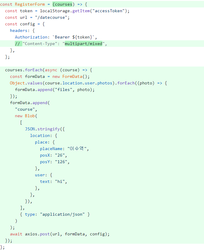처음에는 프론트단에서 FormData에 일반 객체를 담으면 무시되니까 multipart/form-data로 파일 여러개와
