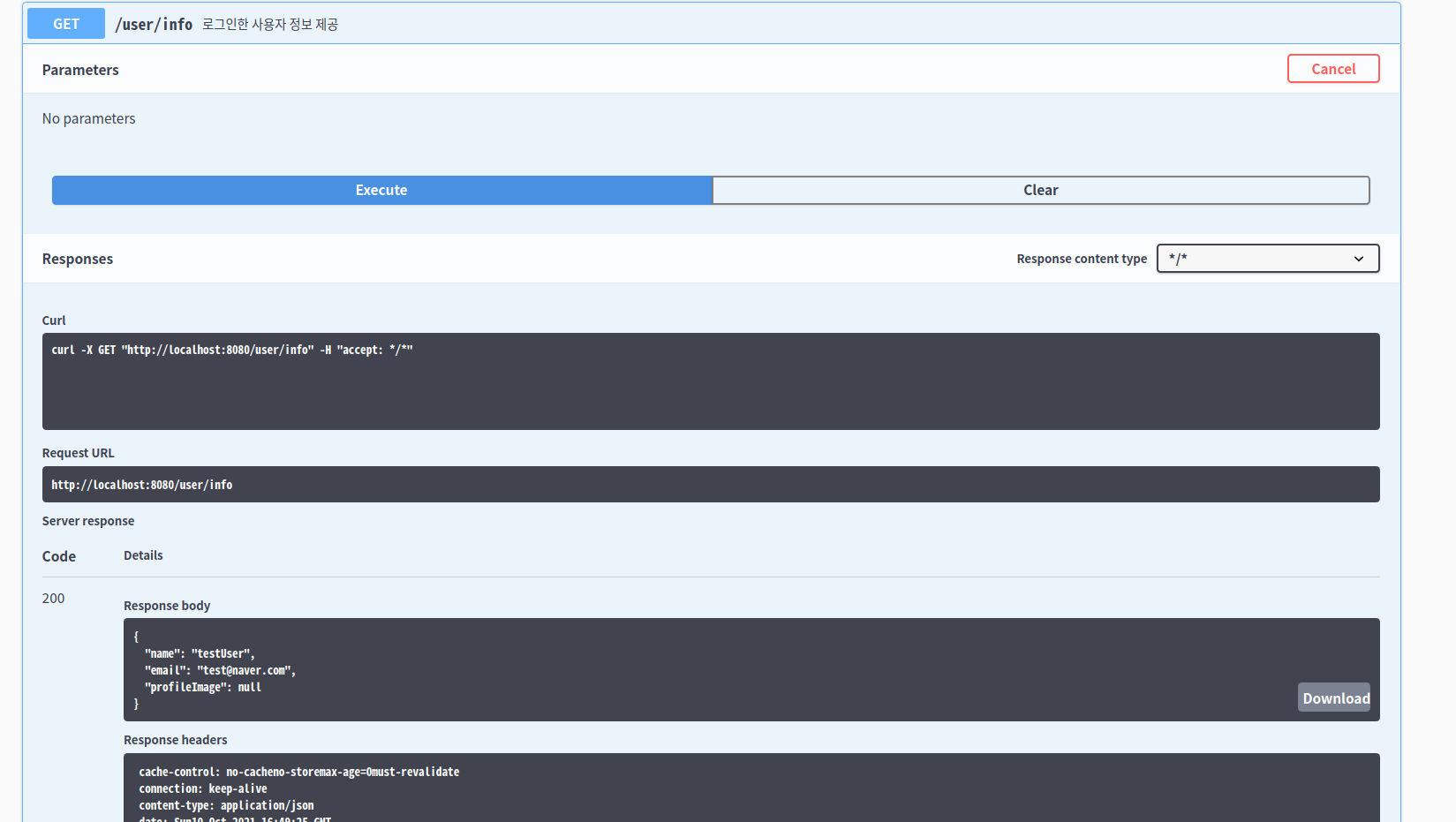 사용자 정보를 요청하는 API를 실행해보면 test용으로 만들어둔 사용자 정보를 성공적으로 반환하는 것을 확인할 수 있습니다.