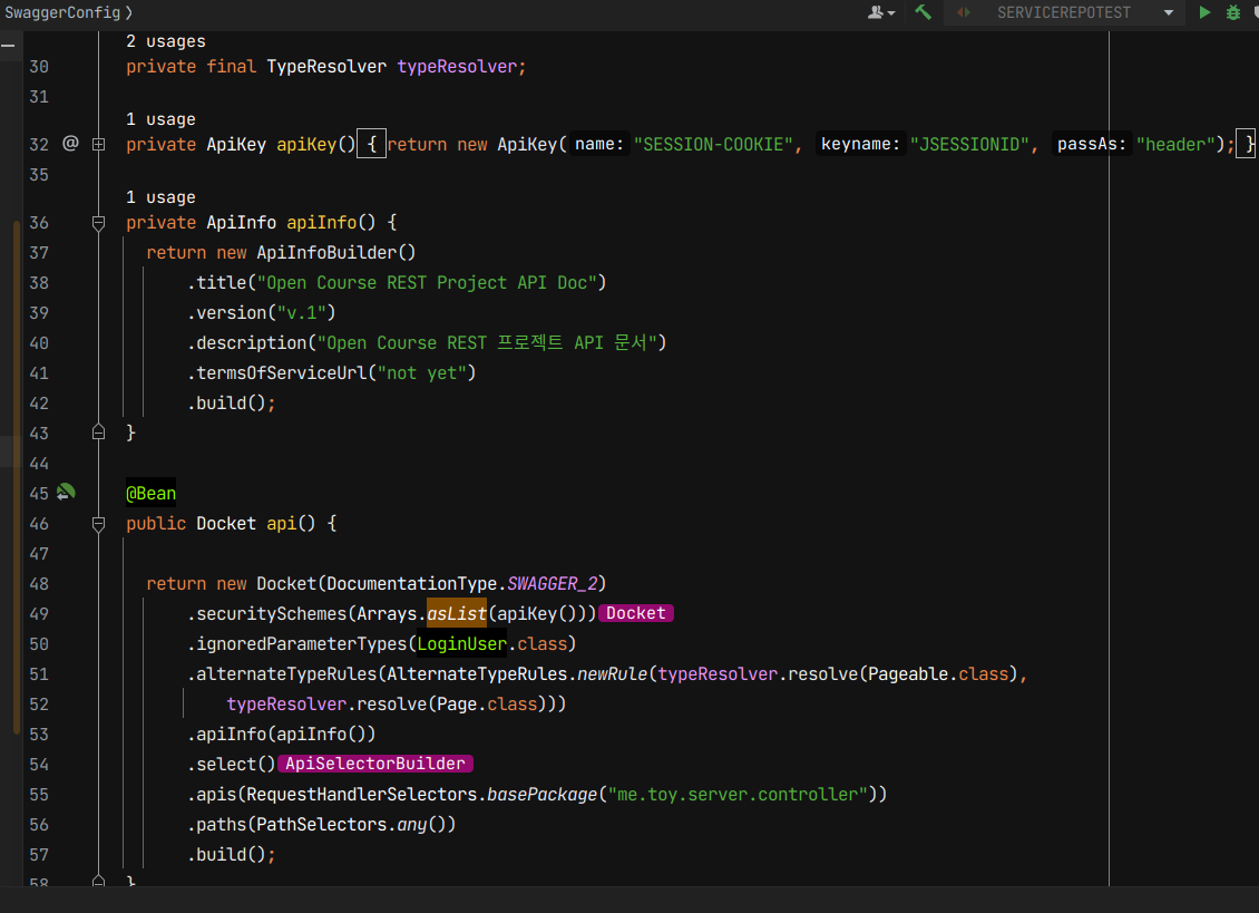 이제 basePackage로 등록한 Controller Package에서 각종 Controller에 Swagger 애너테이션으로 문서에 나타낼 정보들을 표시해주겠습니다.