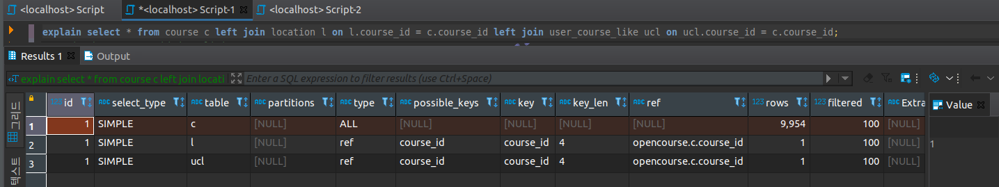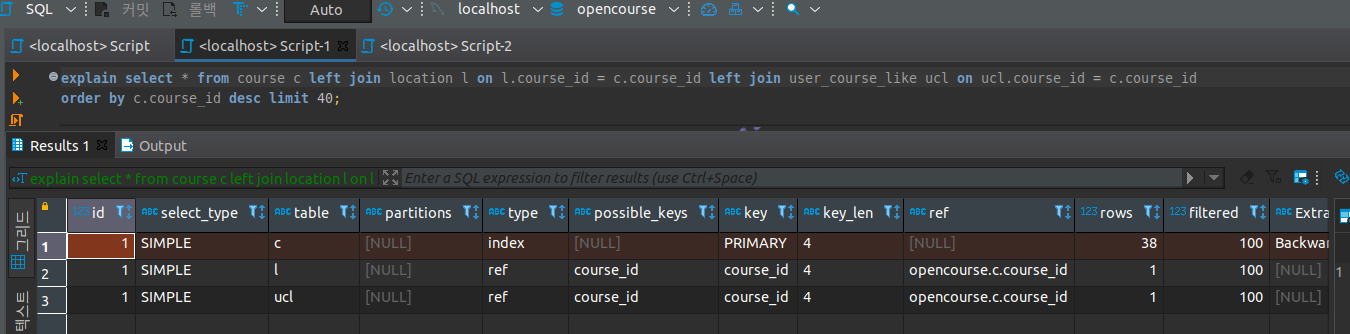 type column을 보면 locatoin 테이블과 course 좋아요에 대한 쿼리는 인덱스를 타고 있지만 course에 경우 type column이 all로 index를 타지 못하고 있습니다.