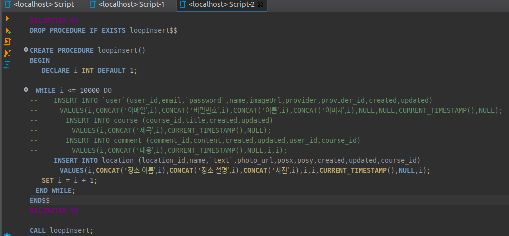 procedure를 만들어서 1만건 씩 dummy 데이터를 적재하고 조회하겠습니다.