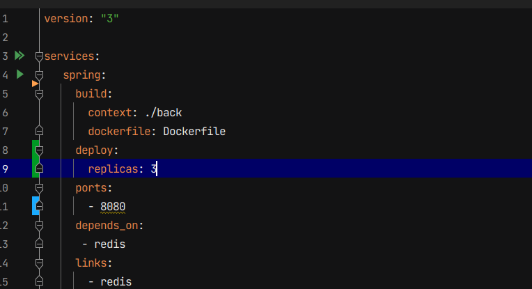 docker-compose.yml 파일에서 replicas값을 3으로 설정하여 3개의 컨테이너가 올라오도록 설정해주고
