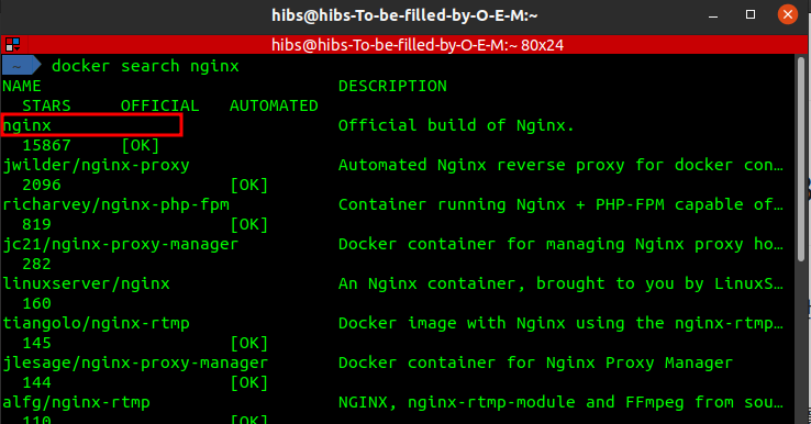 먼저 docker search로 nginx를 찾은 후 이미지를 pull로 댕겨 옵니다.